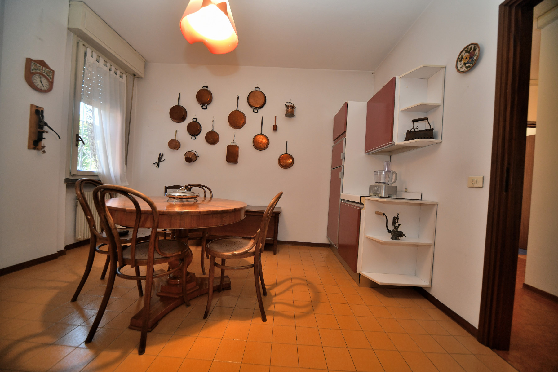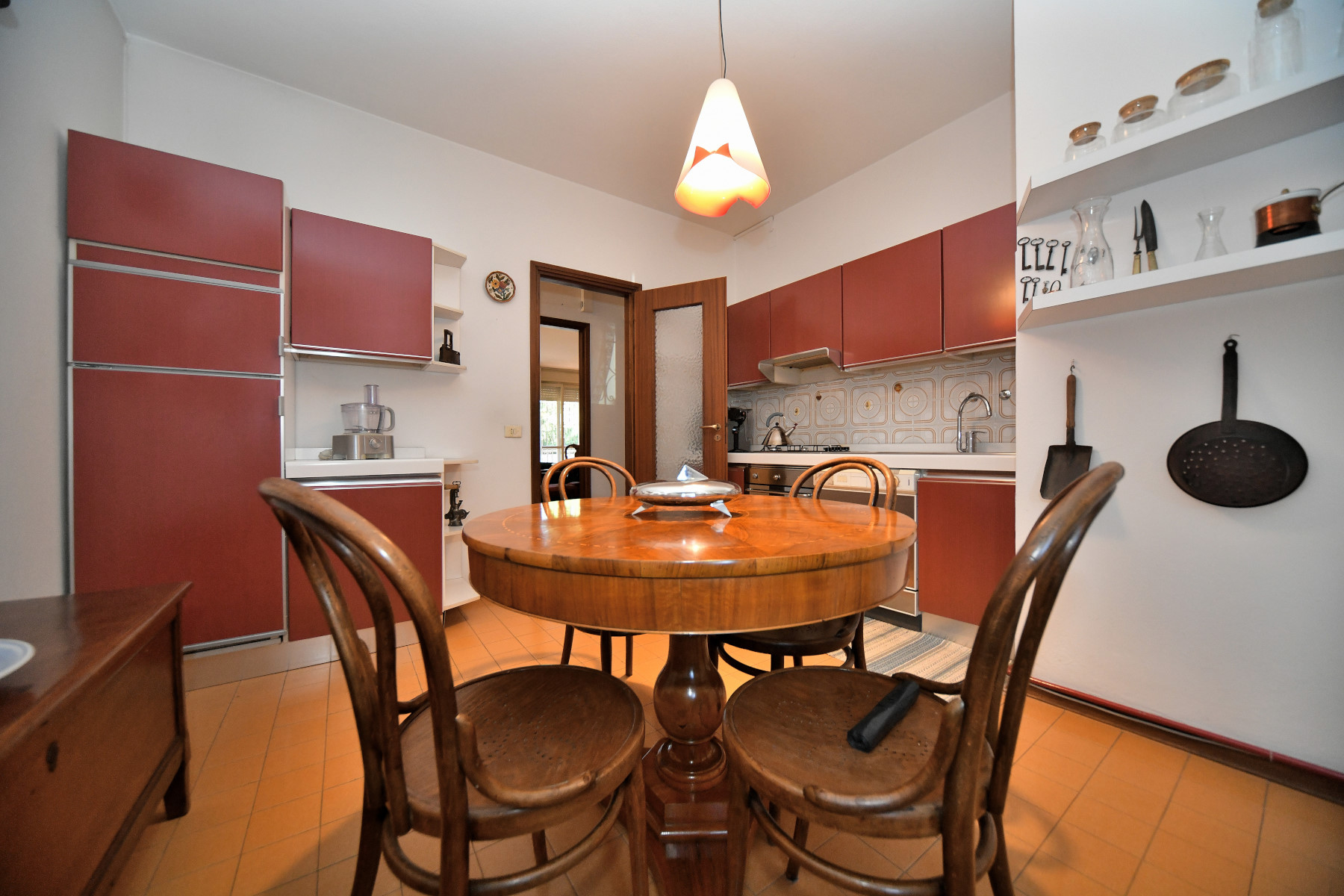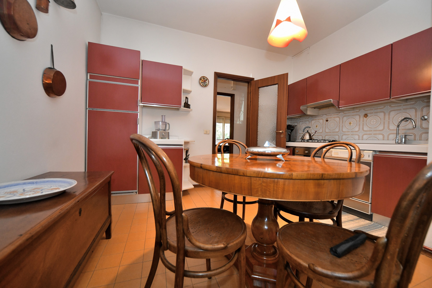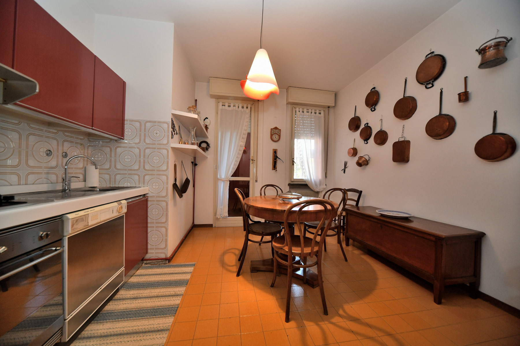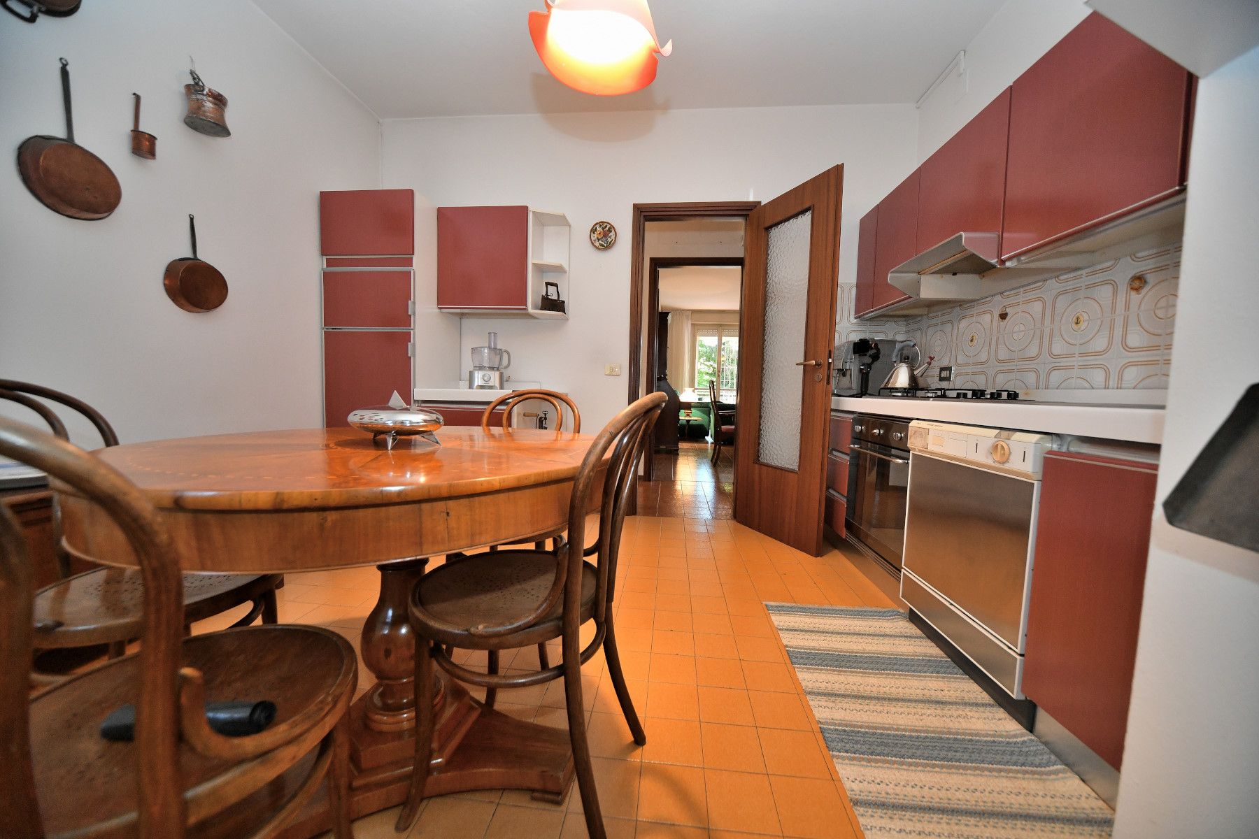 La cucina, ampia e luminosa, è un sogno per chi ama cucinare, con tutto lo spazio necessario e un terrazzino di servizio.